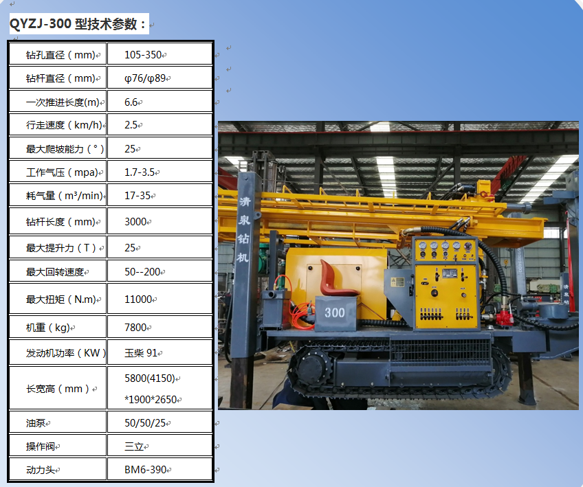 清泉300型潛孔水井鉆機 發(fā)動機功率:玉柴92千瓦。 油泵:美國泊姆克三聯(lián)泵 動力頭馬達: BM6-390。 最大扭矩: 11000扭米。 最大提升力: 25噸v 操作閥:三立。 整機機重: 7. 8噸。 尺寸:長5.8米(底長4.15米),寬1.85米,高2.35米。 鉆孔直徑: 105-350 毫米。 鉆桿直徑:φ76/φ89毫米(3米)。 一次性推進長度: 6600 毫米