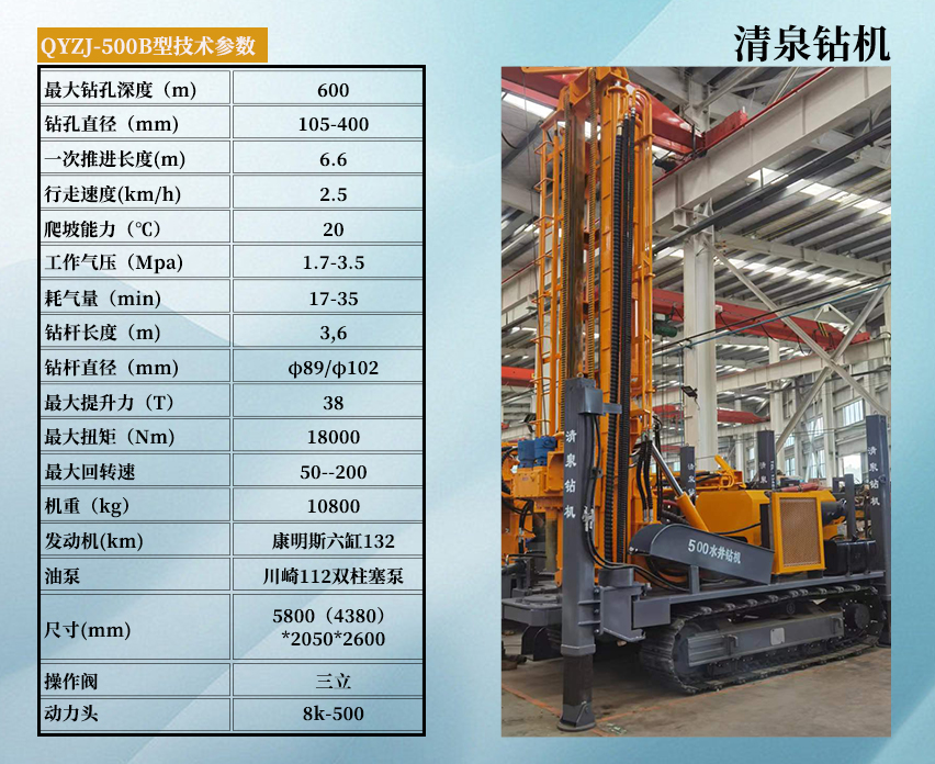 清泉500型潛孔水井鉆機 發(fā)動機功率:康明斯六缸132kw 油泵:川崎112雙柱塞泵 動力頭馬達:8K--500.最大扭矩:18000扭米最大提升力:38噸操作閥:三立整機機重:10.8噸 尺寸:長5.8米(底長4.38米),寬2.05米,高2.6米鉆孔直徑:105-400毫米, 鉆桿直徑:89/$102(3米)。一次性推進長度:6600毫米!